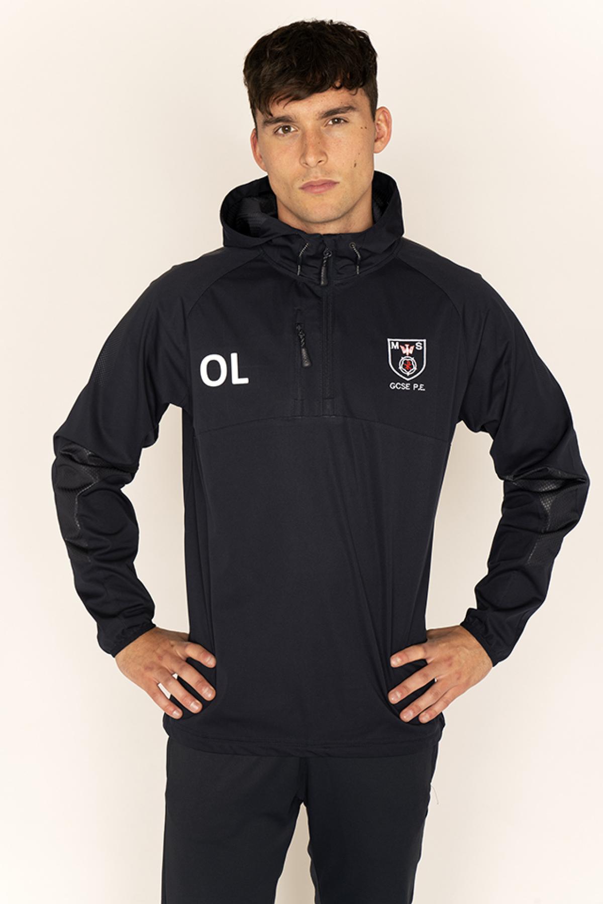1/4 zip hooded pullover top 180gsm 3 layer bonded technical shell Water repellent and fully weatherproof Contoured arm panel in contrast fabric Signature ?Edge? range colour contrast print details Zipped chest pocket Dogtooth shock cord hood adjusters A unique outerwear alternative to basic showerproof jackets and tops