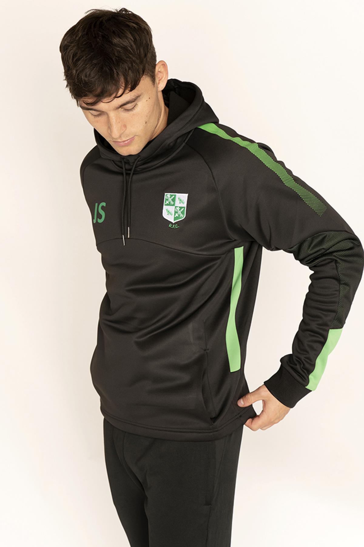 Ultra warm hooded top 220gsm Full dull polyester face with heavy brushed back Contemporary design from pocket pouch Contoured arm panel in two tone contrast mesh fabric Signature ?Edge? range colour contrast print details A forward thinking performance hoody