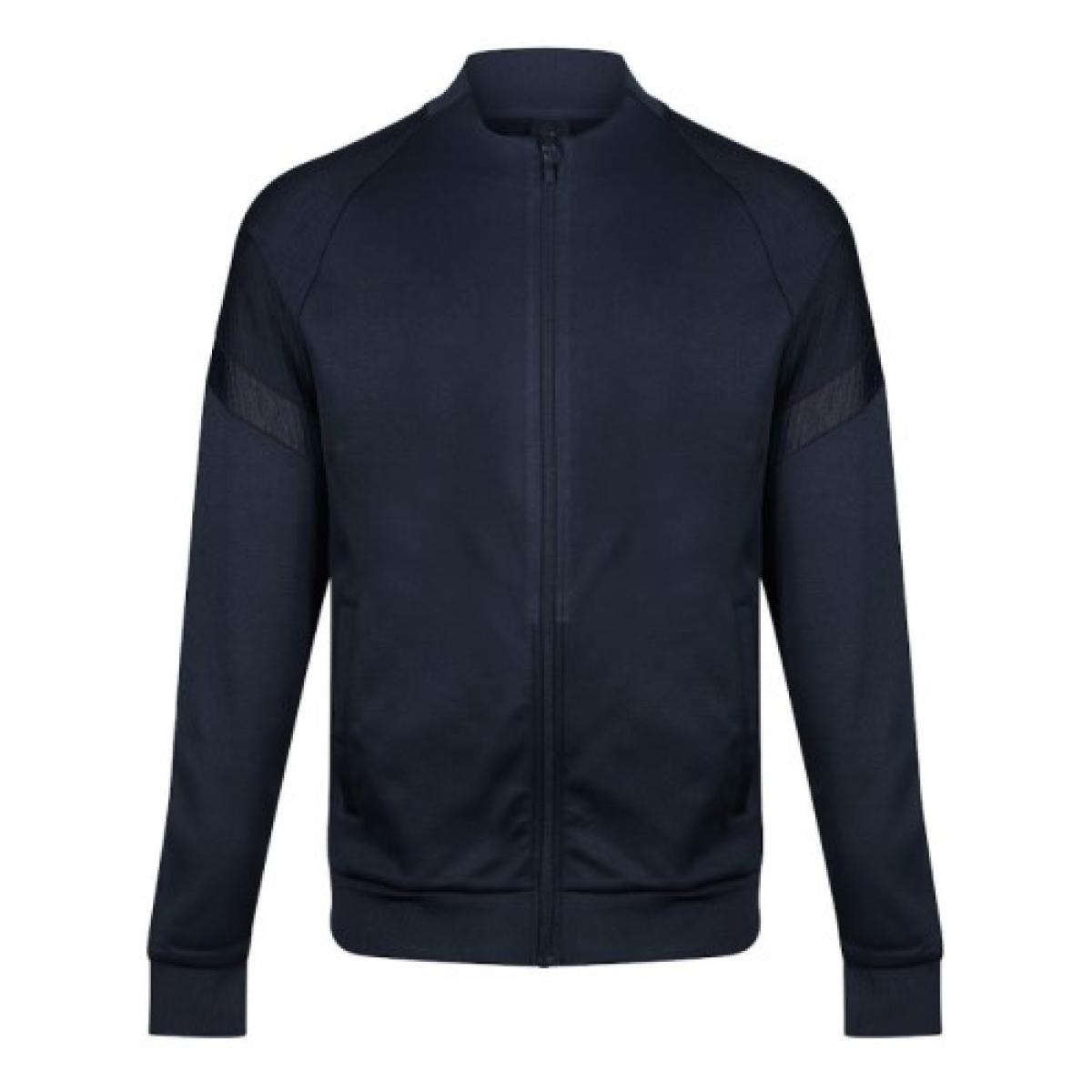 Ergonomic collar design Full zip track top style jacket Premium quality ribbed waistband & cuffs 260gm full dull flat knit polyester with antipill reverse Signature ?Kinetic? contrast colour rubber print details Technical 3D cationic melange effect fabric to shoulder panels, colour insert details